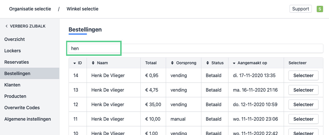 - Klik op de rij of de knop “Selecteer” bij de bestelling die je wenst te bekijken. Vind je de bestelling niet? Gebruik het zoekveld bovenaan de lijst om de bestelling vlot terug te vinden.