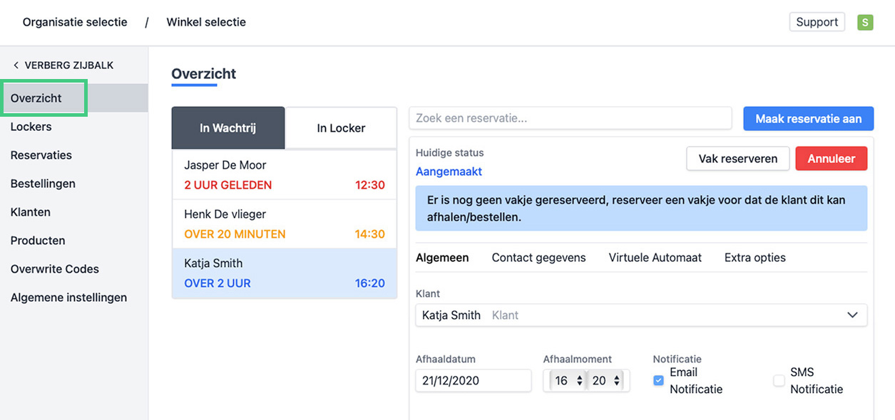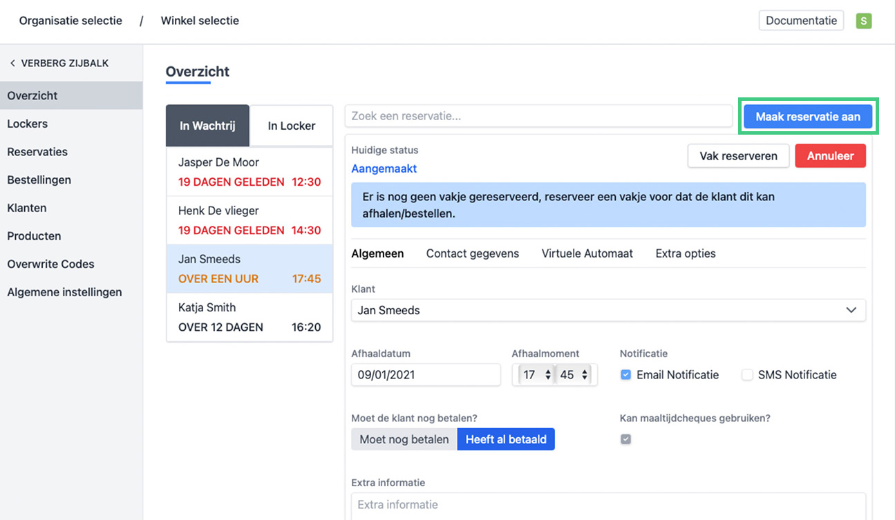 - Vak(ken) vast reserveren - Vink dit aan wanneer je de reservatie na afhaling niet automatisch wil verwijderen, op deze manier kan je bvb een sleutel in een vak leggen voor kuispersoneel.