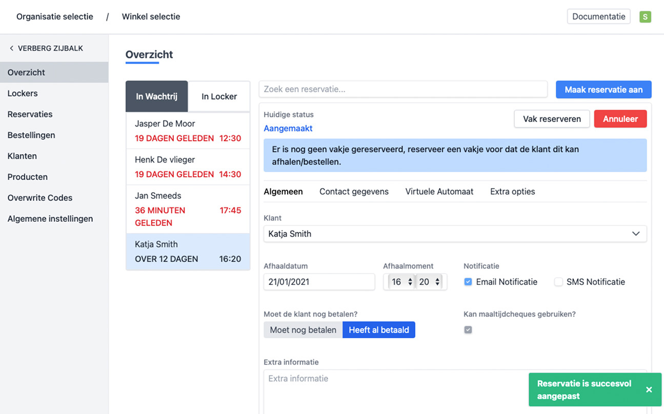 - Vak(ken) vast reserveren - Vink dit aan wanneer je de reservatie na afhaling niet automatisch wil verwijderen, op deze manier kan je bvb een sleutel in een vak leggen voor kuispersoneel.