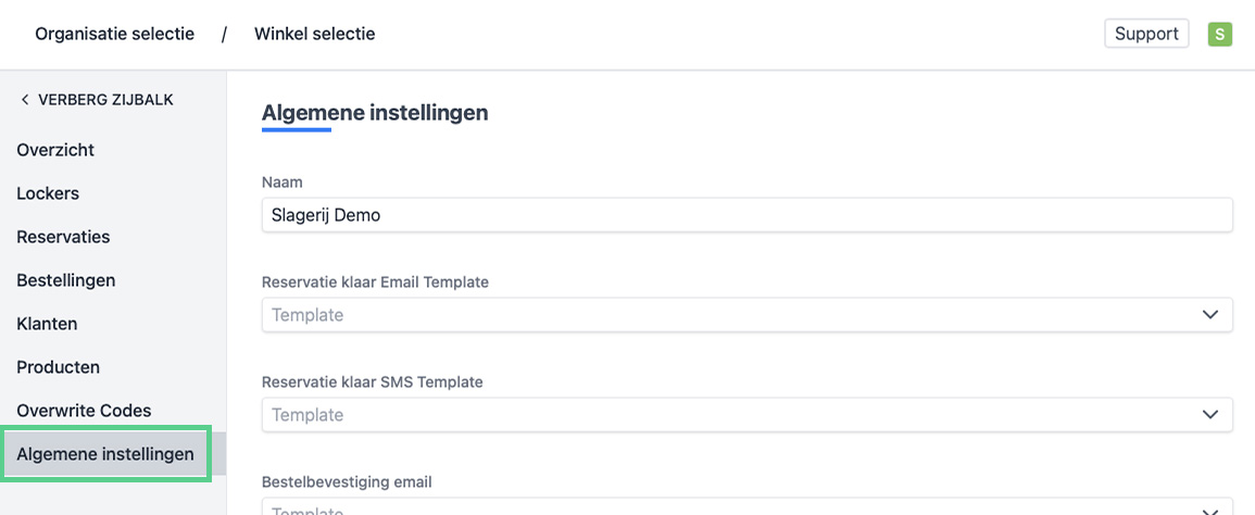 - Tijd voor bevestigingsnotificatie - Maximum aantal minuten voor het afhaalmoment dat de notificatie verstuurd wordt (notificaties worden enkel automatisch gestuurd als de reservatie in de box zit).