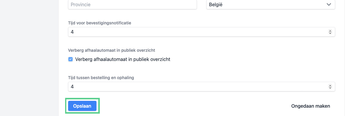 - Verberg afhaalautomaat in publiek overzicht - Indien aangevinkt, zal jouw persoonlijke Virtuele Automaat website niet opgenomen worden in het algemen overzicht op https://afhaalautomaat.eu