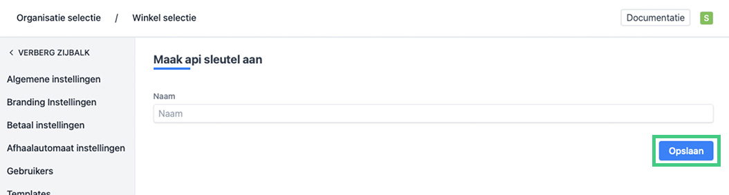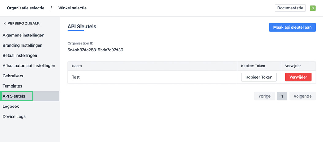 - Klik rechts bovenaan op "Maak api sleutel aan".