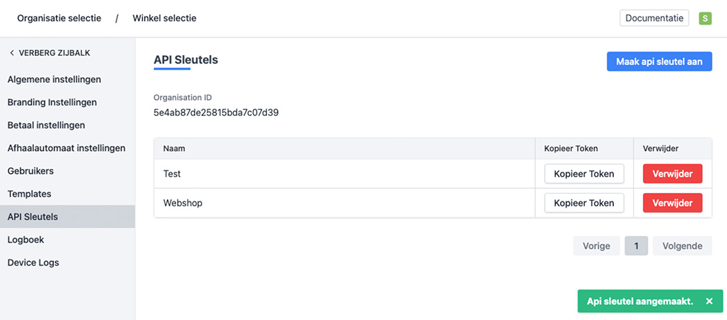 - Bij een succesvolle creatie word je omgeleid naar het overzicht van de api sleutels. Je ziet rechts onderaan een melding dat de sleutel succesvol aangemaakt werd.