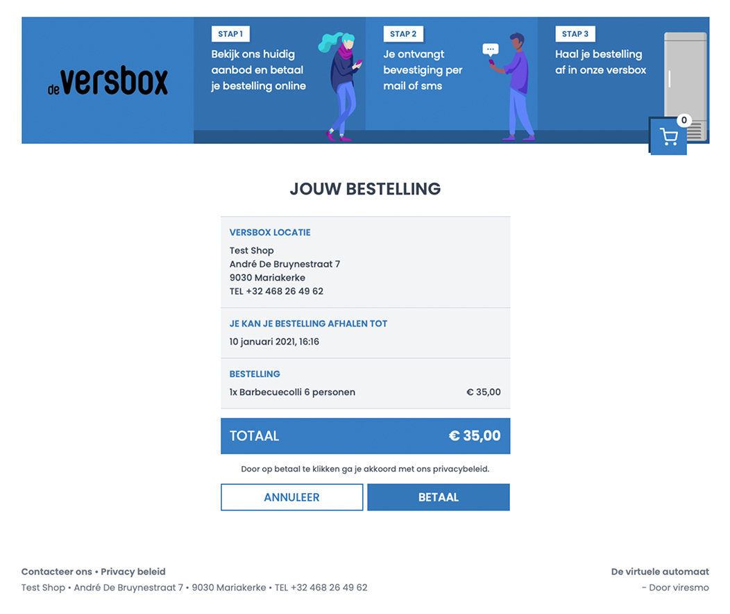 - Wanneer de betaling succesvol was, krijgt de klant hiervan een melding. Het platform zal automatisch de afhaalcode naar de klant versturen.