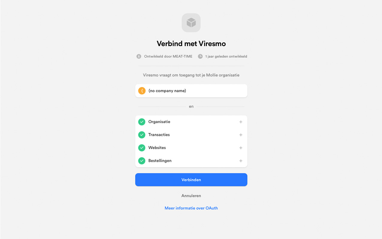 - Na het aanmelden krijg je de vraag of je Viresmo toegang wil geven tot je Mollie organisatie. Bevestig dit door op "Verbinden" te klikken.