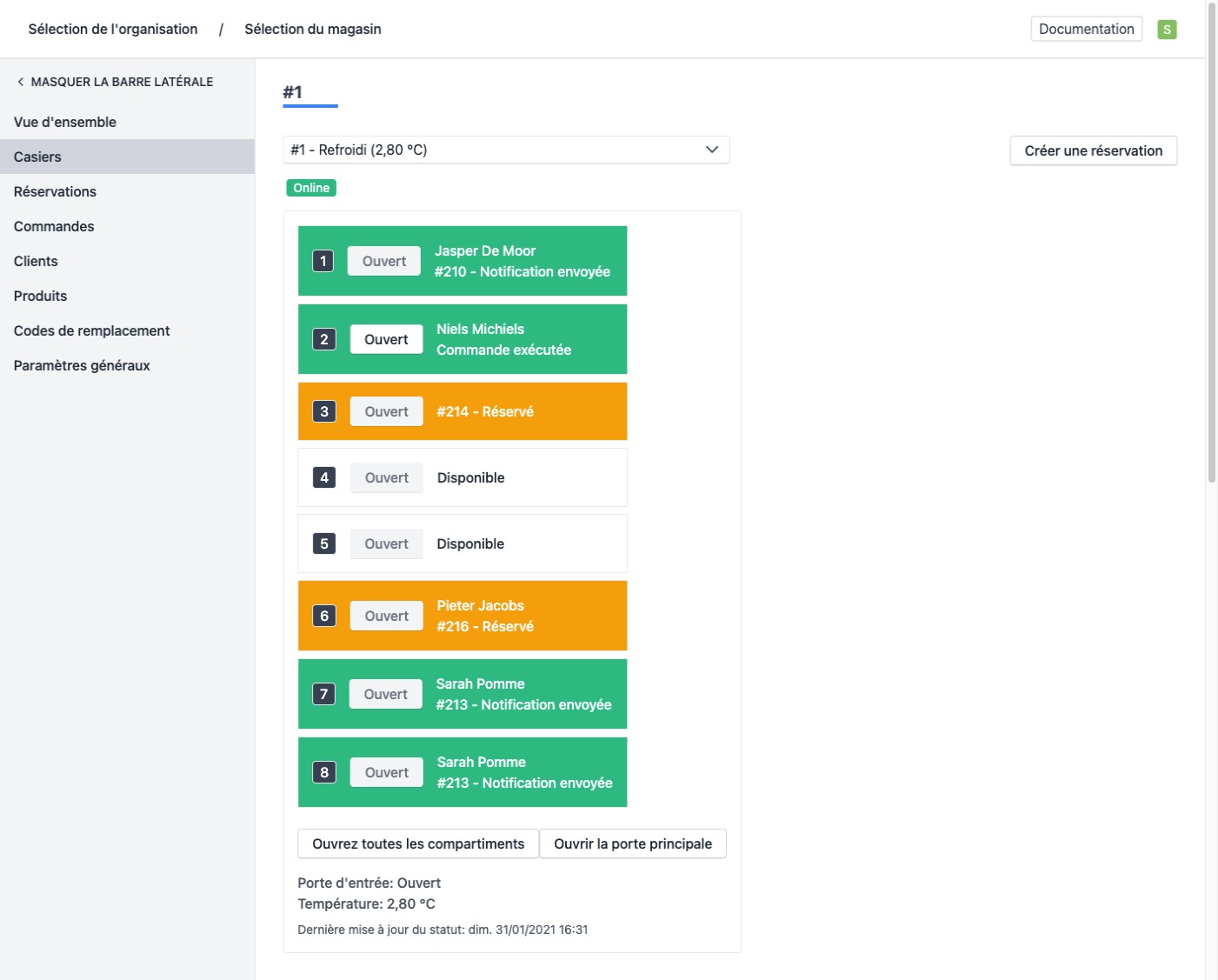 Une réservation peut être modifiée dans «Vue d'ensemble», «Réservations» ou dans Casiers. Pour plus d’informations à propos des autres pages consulter: