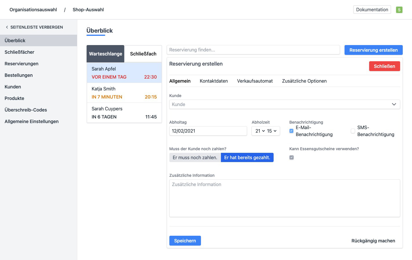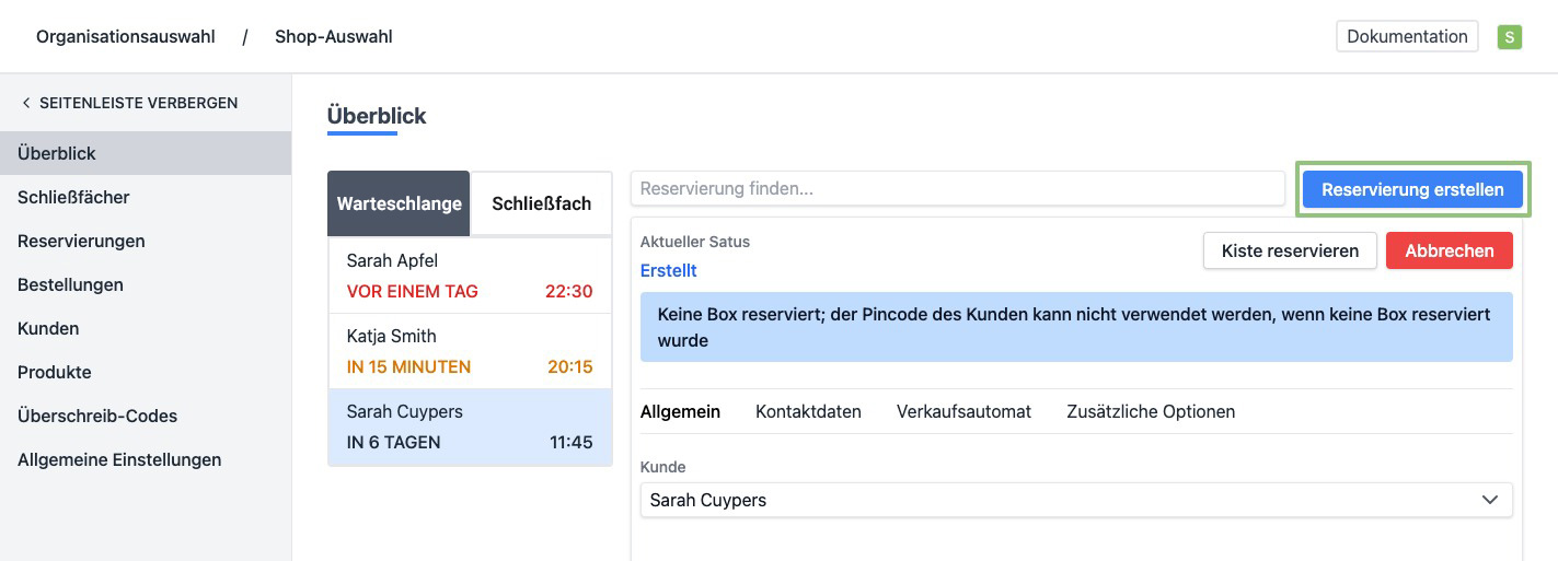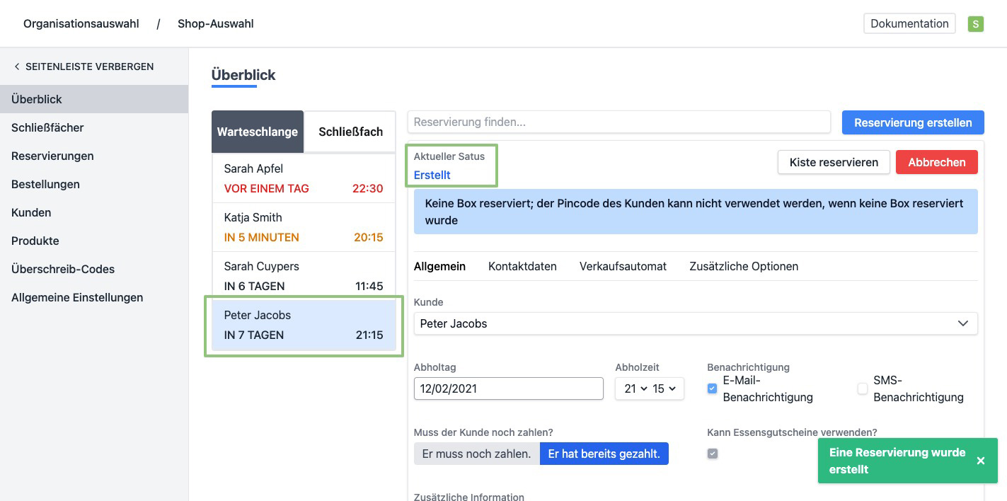 - Sobald eine Reservierung erstellt wurde, muss noch ein Fach zugewiesen werden. Eingehende Bestellungen kannst du also immer bereits auf der Plattform erstellen und sie erst später in ein Fach platzieren.