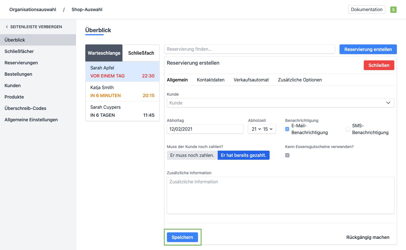 - Wenn alle Reservierungsdaten eingetragen wurden, klicke auf “Speichern”.