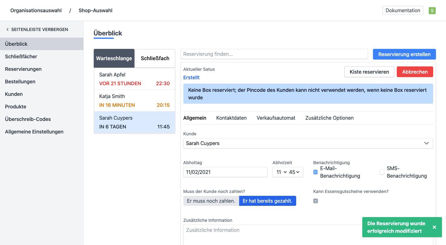 - Fach/Fächer fest reservieren - Kreuze diese Option an, wenn du die Reservierung nach Abholung nicht automatisch entfernen möchtest, so kannst du beispielsweise für Reinigungspersonal einen Schlüssel in ein Fach legen.