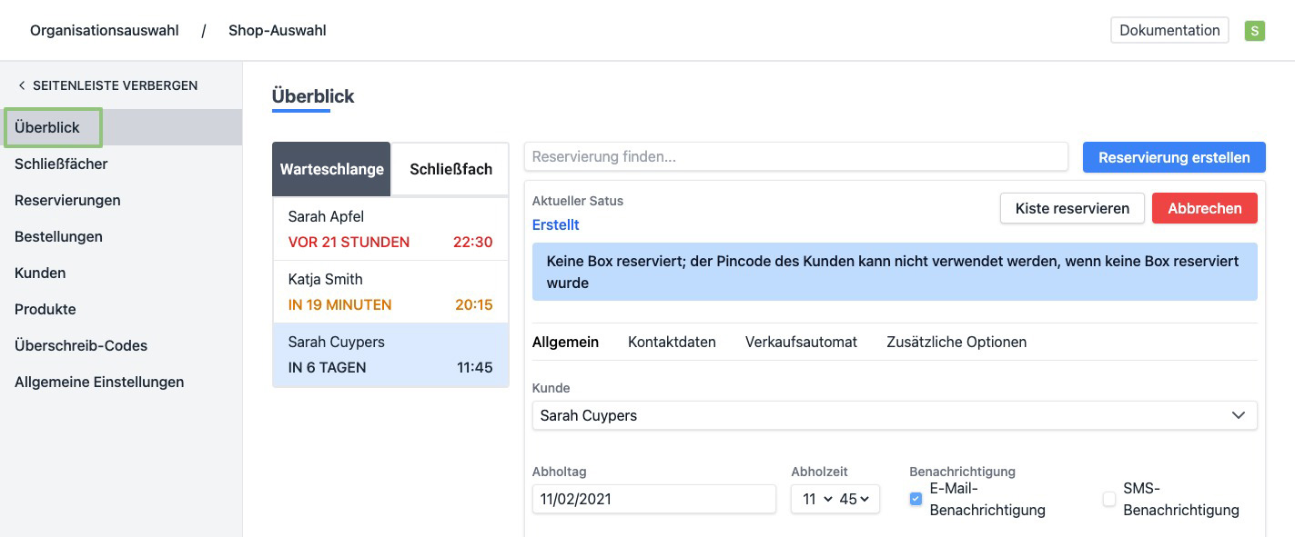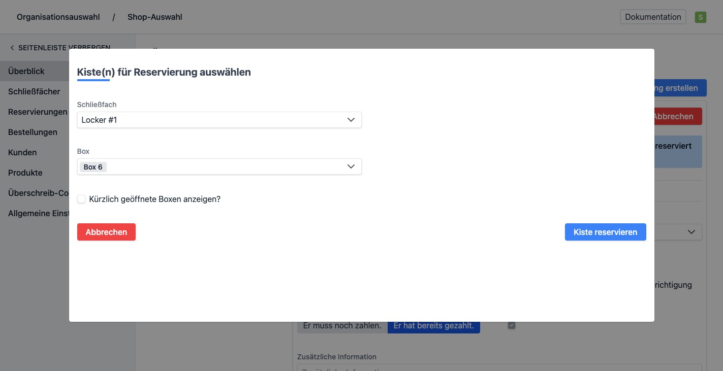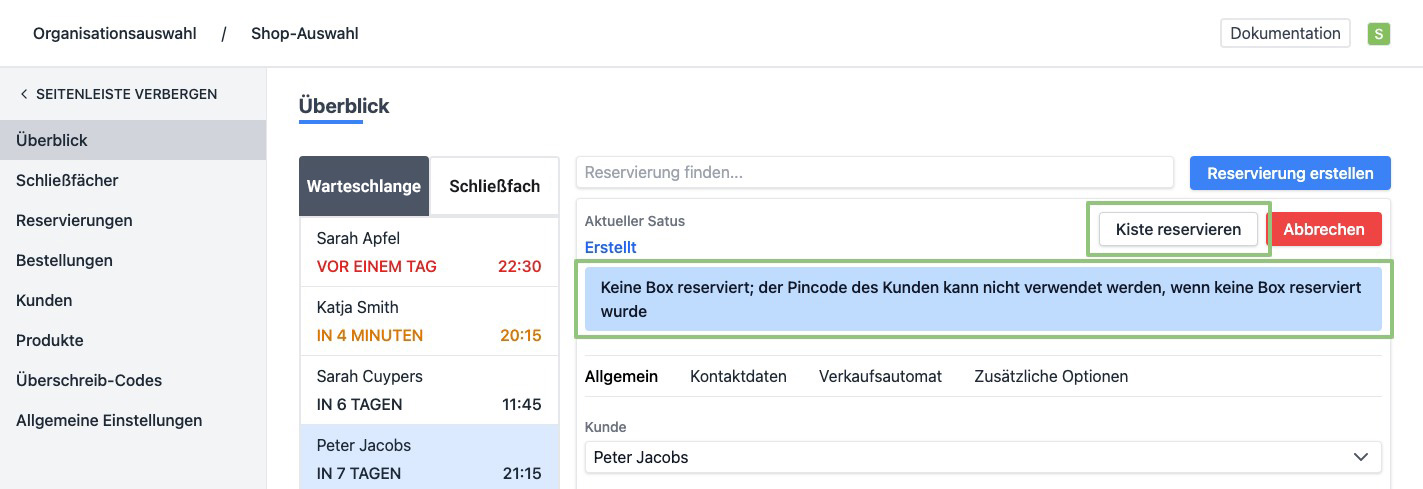 Um eine Reservierung in ein Fach zu platzieren, musst du zuerst eine Reservierung erstellen. Weitere Informationen über die Erstellung einer Reservierung findest du unter Wie erstelle ich eine Reservierung? oder Wie erstelle ich eine Reservierung für den virtuellen Automaten?