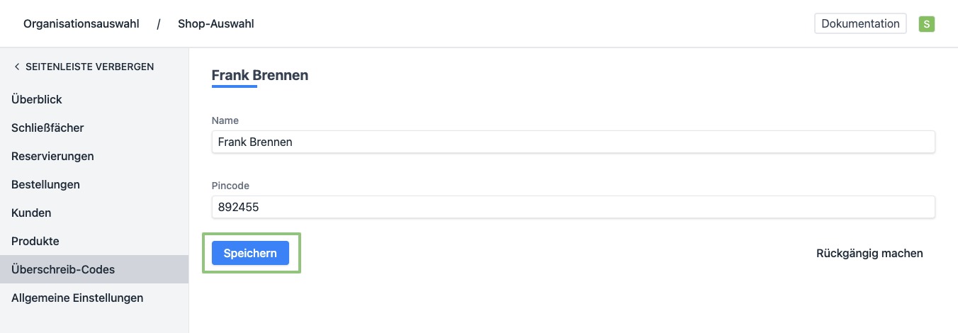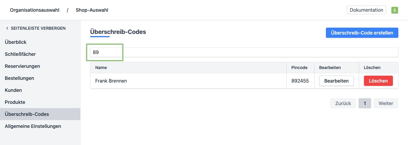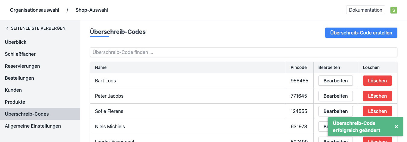 - Bei einer erfolgreichen Änderung wirst du zur Übersicht der Overwrite-Codes umgeleitet. Rechts unten siehst du eine Mitteilung, dass der Code erfolgreich geändert wurde.