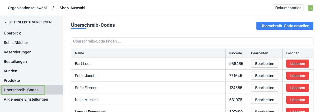 - Dir wird eine Liste mit allen Overwrite-Codes angezeigt, die aktuell in Gebrauch sind. Klicke rechts oben auf "Einen Overwrite-Code erstellen".