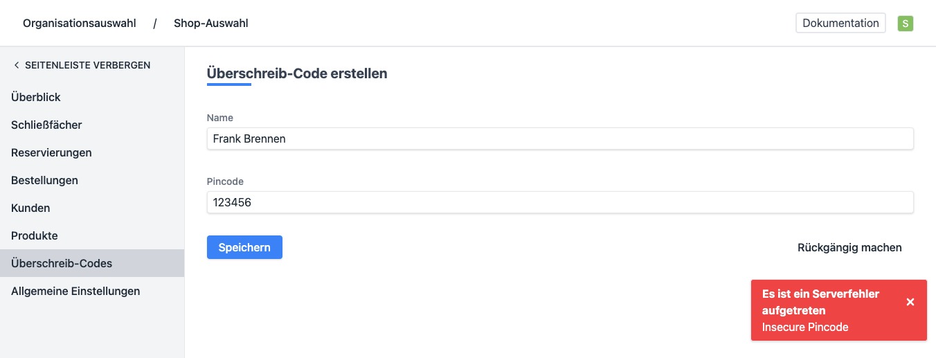 Achtung, naheliegende Codes wie „123456“ oder „778899“ werden nicht akzeptiert. Wenn du diese dennoch eingibst und auf "Speichern" klickst, erscheint eine Fehlermeldung.