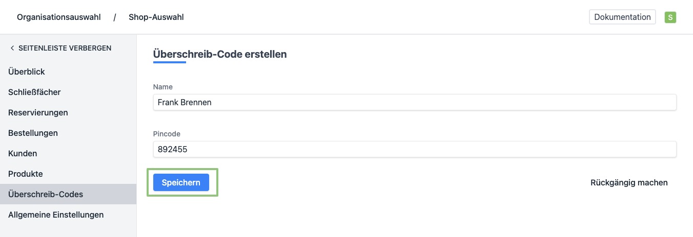 Achtung, es können maximal 10 Overwrite-Codes erstellt werden.
