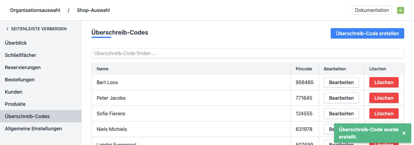 - Bei einer erfolgreichen Erstellung wirst du zur Übersicht der Overwrite-Codes umgeleitet. Rechts unten siehst du eine Mitteilung, dass der Code erfolgreich erstellt wurde.