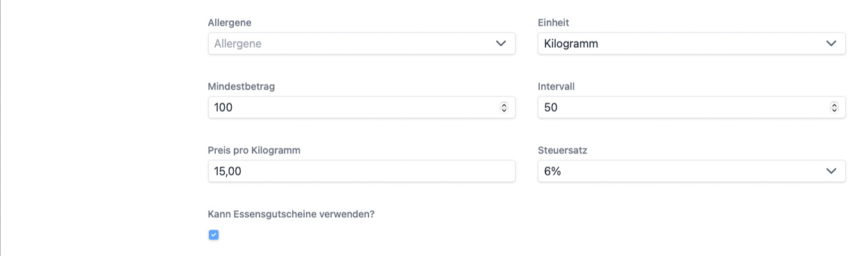 Zum Beispiel: Ich möchte Salami mit Knoblauch verkaufen, diese darf zu 15,00 EUR je kilogramm verkauft werden, bei einer Mindestabnahmemenge von 100 g. Meine Mengen werden immer auf 50gr gerundet.