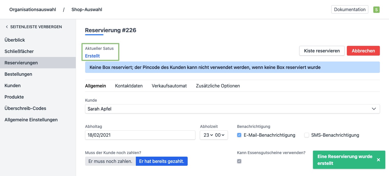 - Bei einer erfolgreichen Erstellung wird die Seite neu geladen und oben kannst du den Status der Reservierung finden. Rechts unten siehst du eine Mitteilung, dass die Reservierung erfolgreich erstellt wurde.