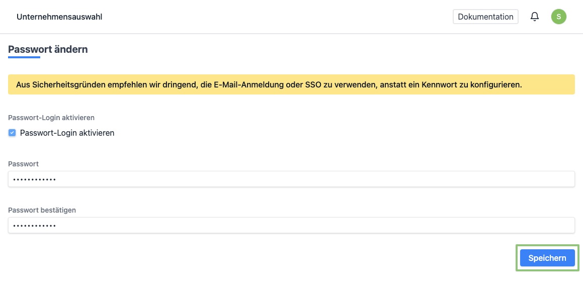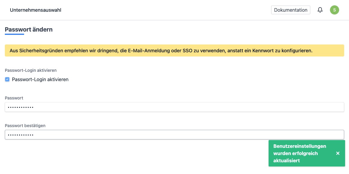Beachtung! Aus Sicherheitsgründen empfehlen wir dringend, die E-Mail-Anmeldung oder SSO zu verwenden, anstatt ein Kennwort zu konfigurieren. Bei Verwendung der Single Sign-On-Anmeldemethode wird bei jeder Anmeldung ein Code an Ihre E-Mail-Adresse gesendet. Anschließend geben Sie den Code als letzten Anmeldeschritt auf der Site ein.