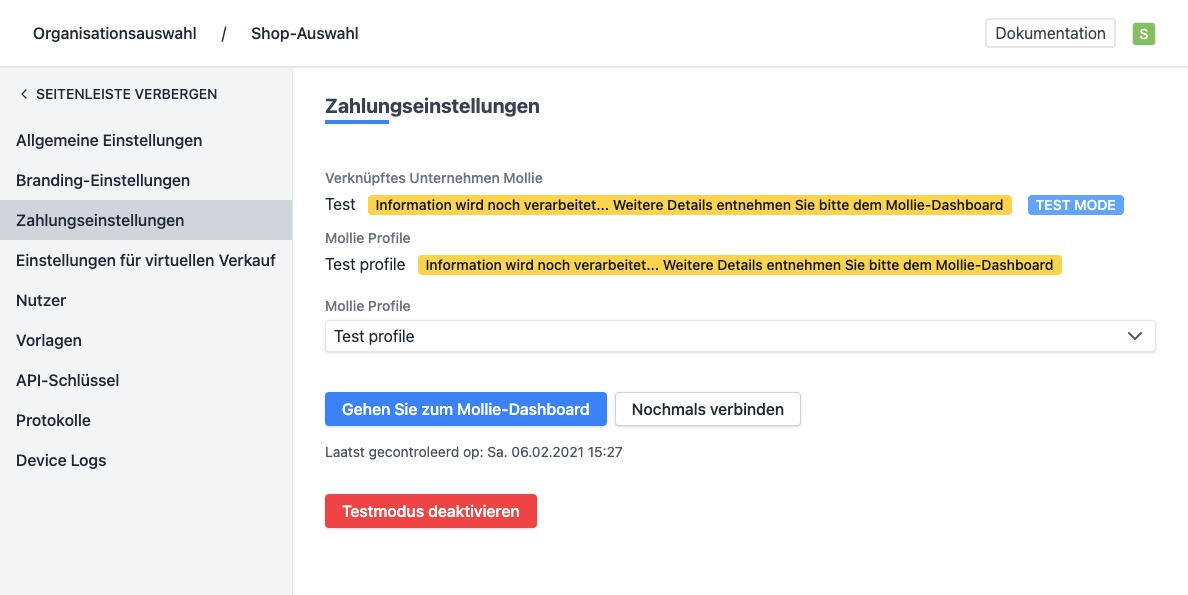 Wenn der Status lautet: "Daten werden noch verarbeitet, weitere Informationen sind dem Mollie-Dashboard zu entnehmen", wird empfohlen, sich auf deinem Mollie-Konto anzumelden und nachzusehen, welche Daten fehlen. Dein Mollie-Konto muss aktiviert sein, um korrekt zu funktionieren.