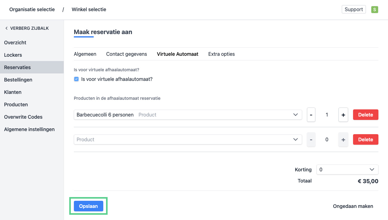 - Producten in de virtuele automaat reservatie - Voeg hier alle producten toe die je in het vak wil plaatsen, dit kan zowel een colli als een alleenstaand product zijn. Voor meer informatie over hoe je producten aanmaakt, klik hier.