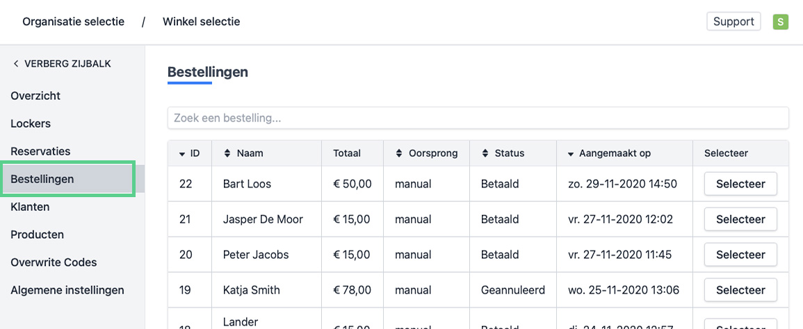 - Klik op de rij of de knop “Selecteer” bij de bestelling die je wenst te bekijken. Vind je de bestelling niet? Gebruik het zoekveld bovenaan de lijst om de bestelling vlot terug te vinden.