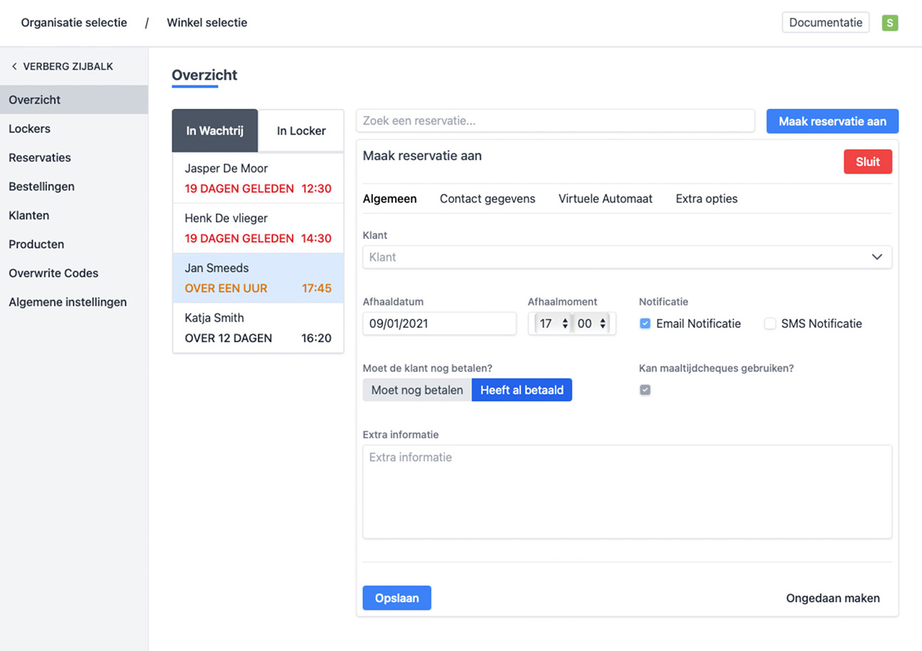 - Vak(ken) vast reserveren - Vink dit aan wanneer je de reservatie na afhaling niet automatisch wil verwijderen, op deze manier kan je bvb een sleutel in een vak leggen voor kuispersoneel.