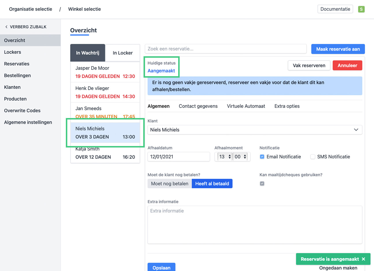 - Bij een succesvolle creatie wordt de pagina opnieuw ingeladen en kan je de status van de reservatie bovenaan terugvinden. De reservatie werd automatisch toegevoegd aan de wachtrij lijst links. Rechts onderaan zie je een melding dat de reservatie succesvol aangemaakt werd.
