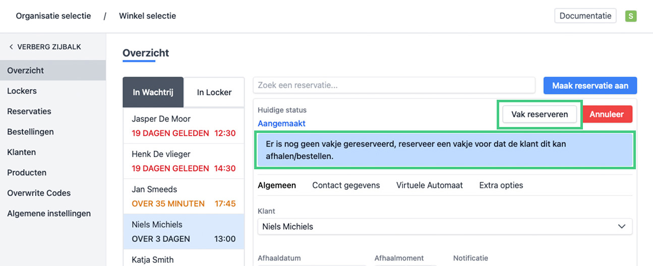 - Eenmaal een reservatie aangemaakt werd moet er nog een vak aan toegekend worden. Je kan binnengekomen bestellingen dus altijd reeds aanmaken in het platform en ze pas later in een vak plaatsen.