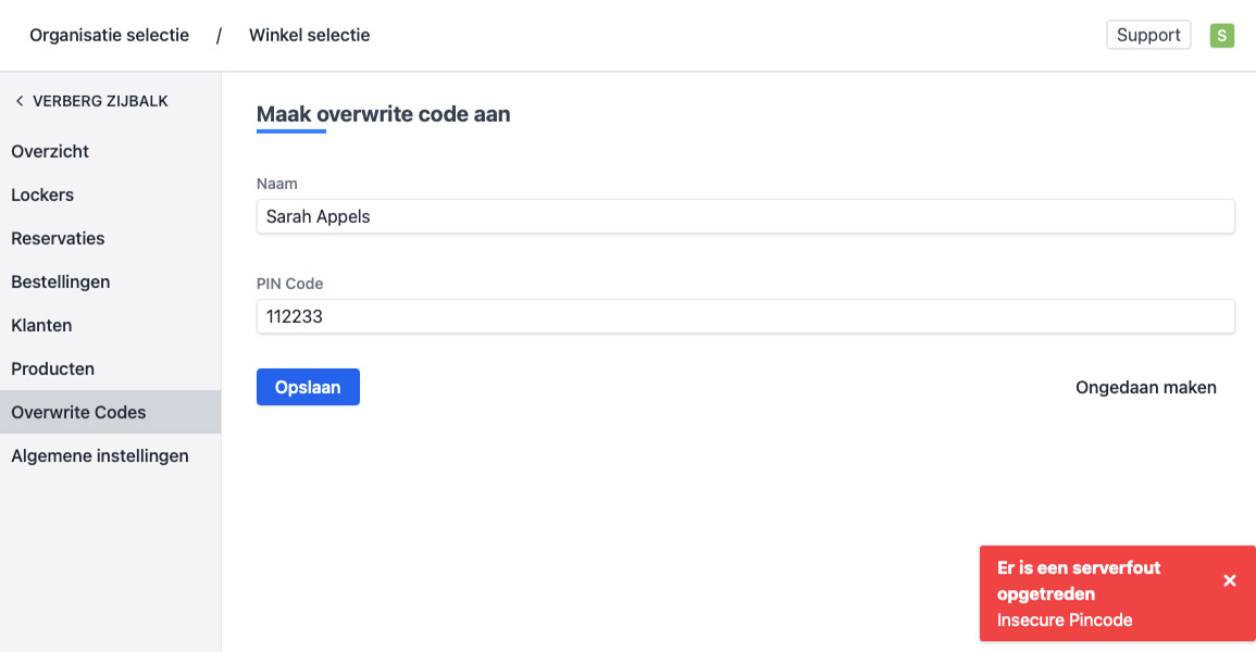 Opgelet, voor de hand liggende codes zoals "123456" of "778899" zullen niet aanvaard worden. Wanneer je deze toch ingeeft en op "Opslaan" klikt, zal je een foutmelding te zien krijgen.