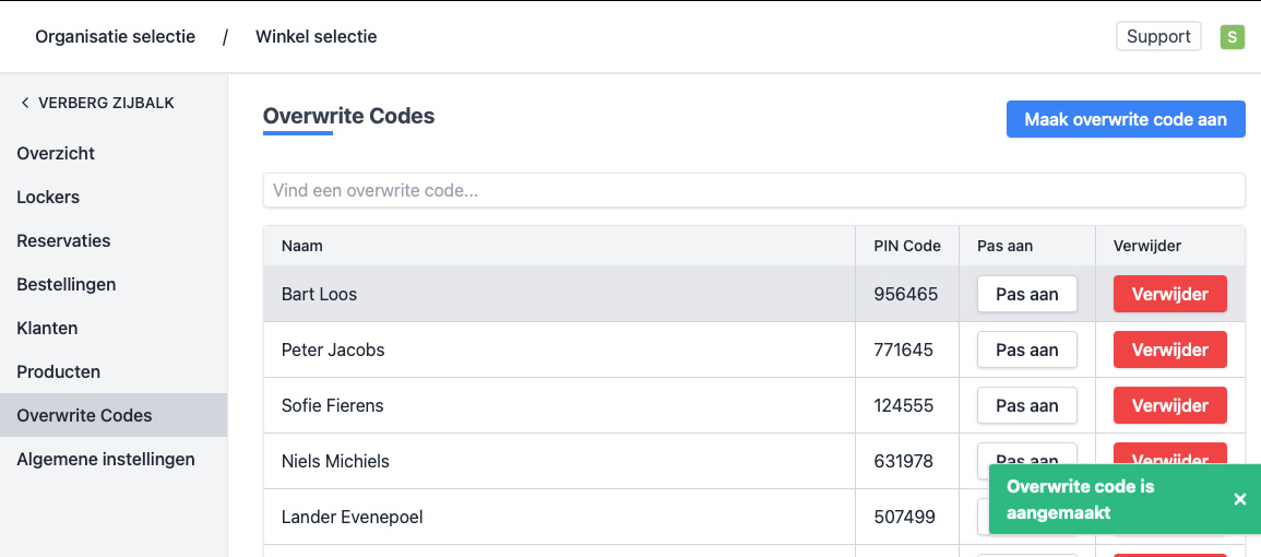 - Bij een succesvolle creatie word je omgeleid naar het overzicht van de overwrite codes. Je ziet rechts onderaan een melding dat de code succesvol aangemaakt werd.
