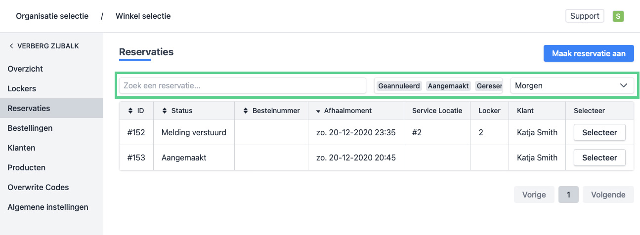 - Klik op de rij of de knop “Selecteer” bij de reservatie die je wenst aan te passen. Vind je de reservatie niet? Gebruik het zoekveld bovenaan de lijst om de reservatie vlot terug te vinden.