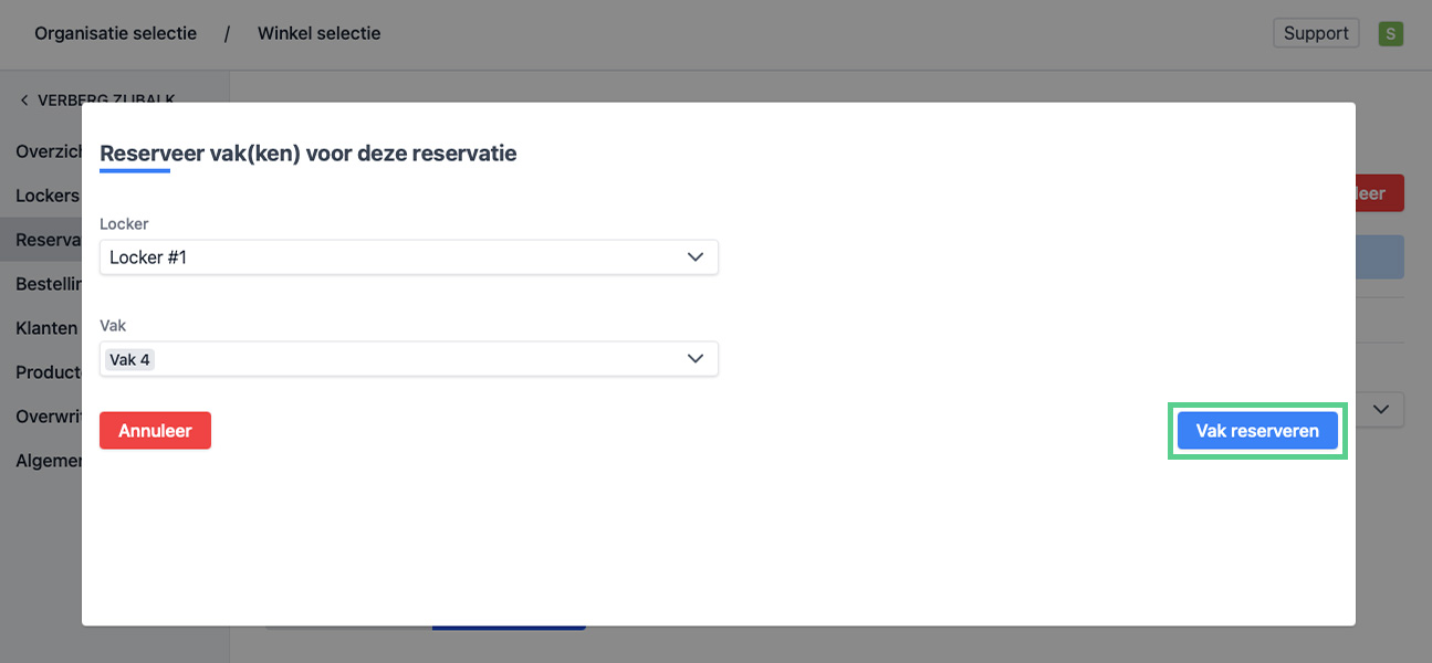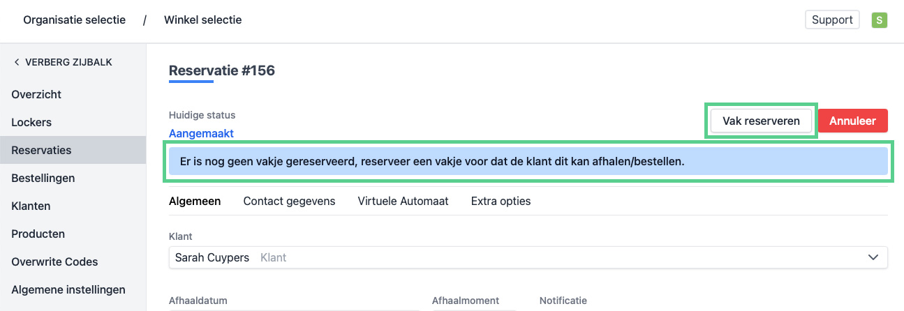 Om een reservatie in een vak te plaatsen, dien je eerst een reservatie aan te maken. Voor meer informatie over hoe je een reservatie aanmaakt, zie Hoe maak ik een reservatie aan? of Hoe maak ik een reservatie aan voor de Virtuele Automaat?