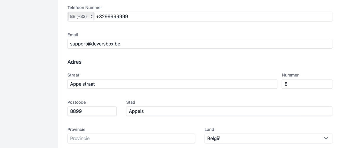 - Contactgegevens: Telefoonnummer, Email, Straat, Nummer, Postcode, Stad, Provincie, Land