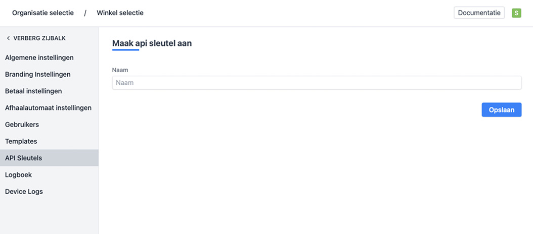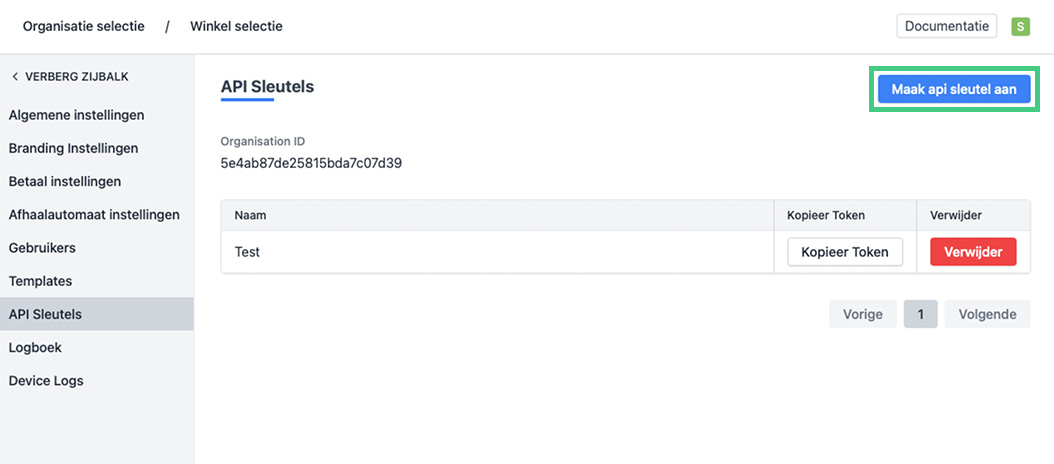 - Klik rechts bovenaan op "Maak api sleutel aan".