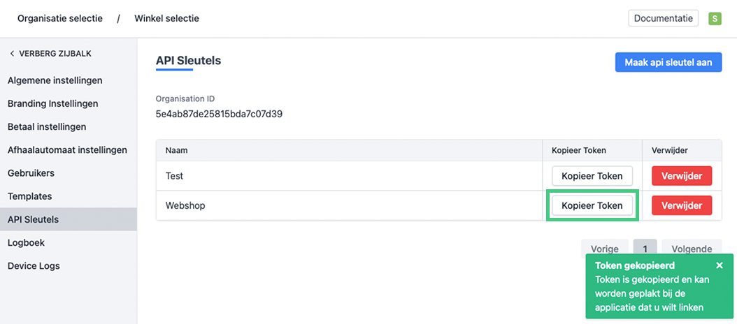 - Om je token te gebruiken, klik op "Kopieer Token". De token wordt gekopieerd en is beschikbaar via je klembord.