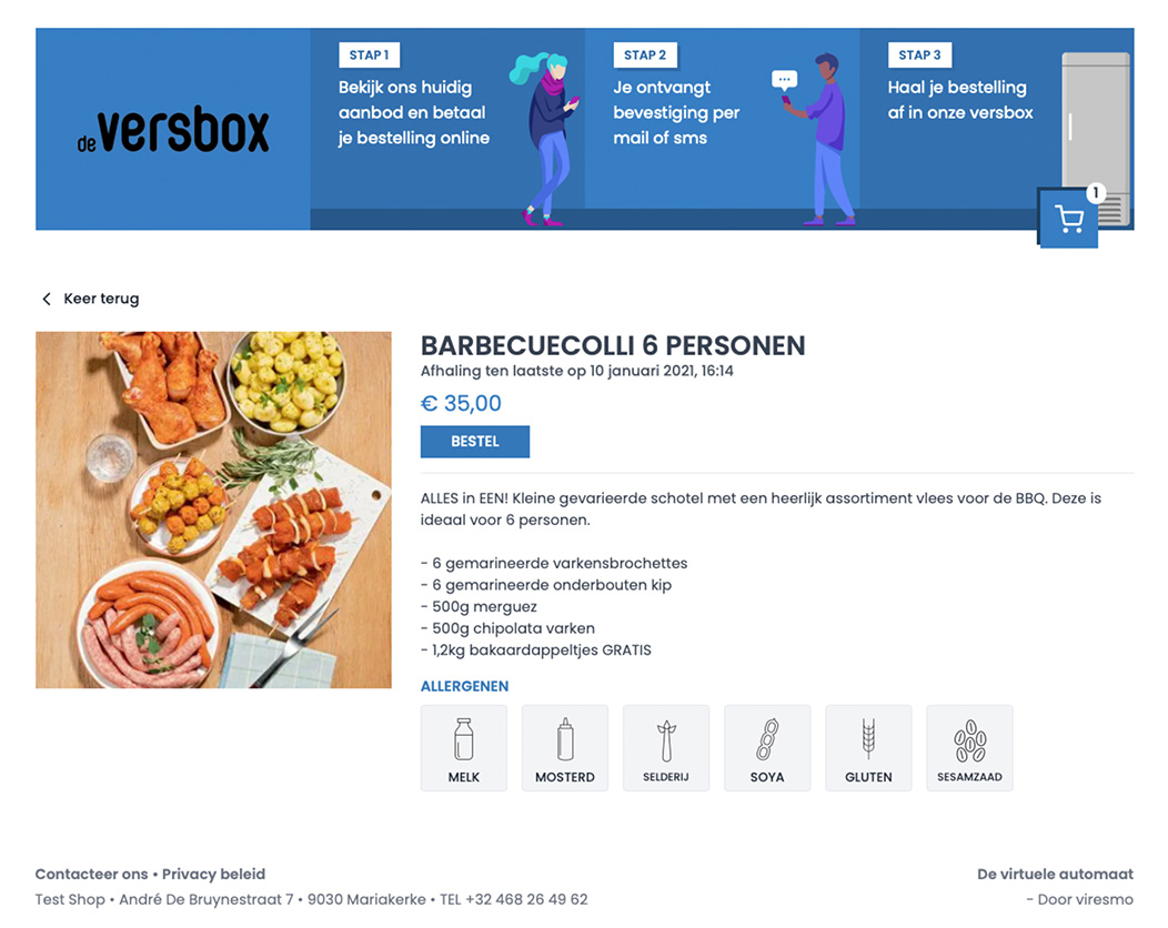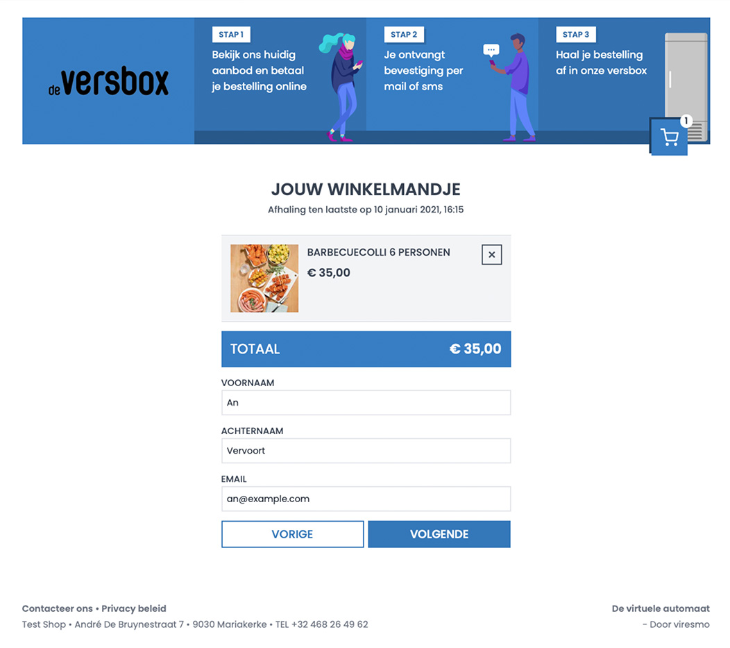 - Om een product toe te voegen aan het mandje, klikt men op "Bestel". Je klant wordt omgeleid naar zijn Winkelmandje. Indien hij klaar is met bestellen, vult hij zijn gegevens in. Deze gegevens dienen om een melding met zijn afhaalcode te kunnen versturen. Vervolgens klikt men op "Volgende".