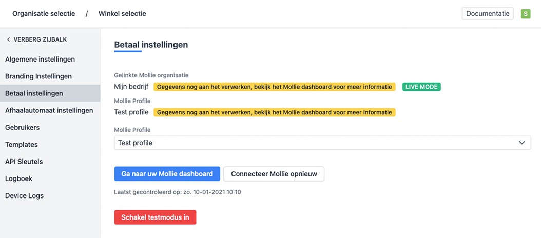Indien de status aangeeft: "Gegevens nog aan het verwerken, bekijk het Mollie dashboard voor meer informatie", is het aangeraden om aan te melden op je Mollie account en na te gaan welke gegevens onbtreken. Je Mollie account dient geactiveerd te zijn voor een correcte werking.