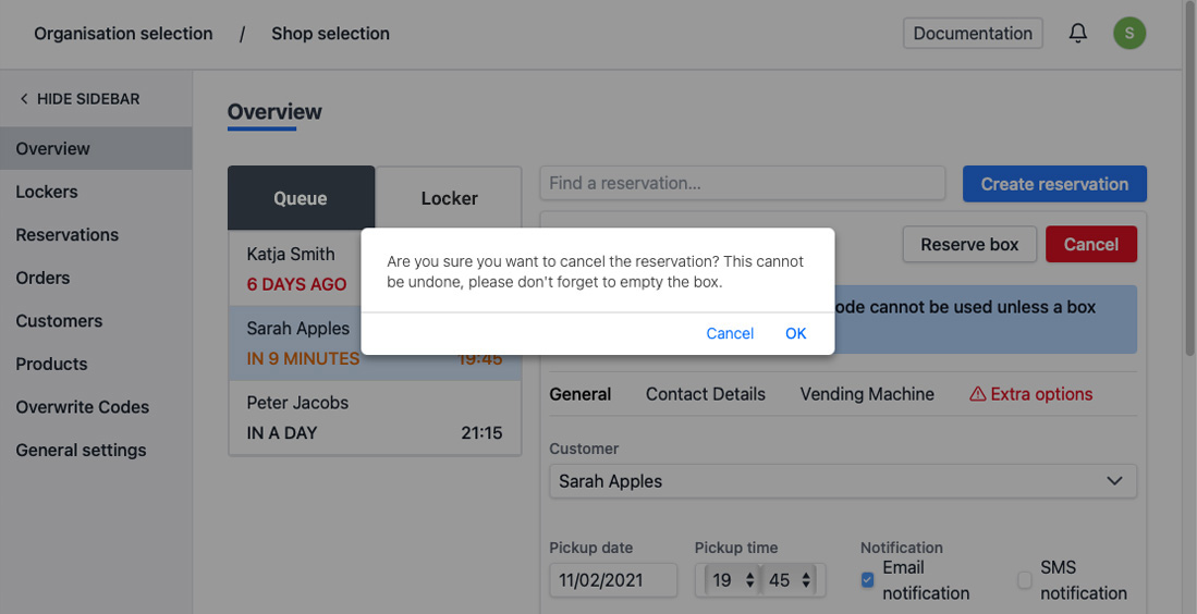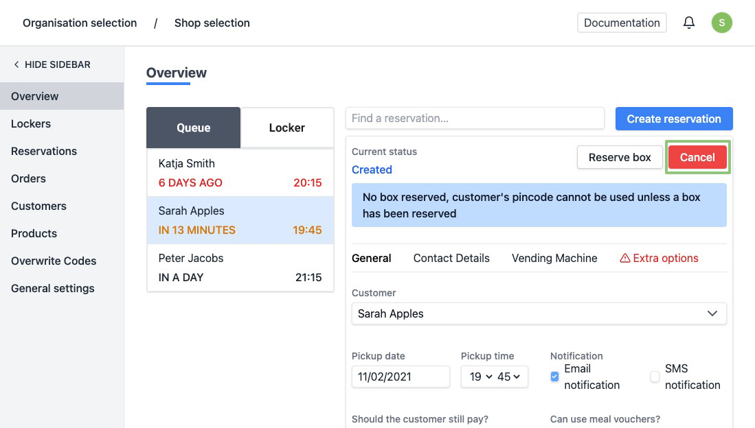 Attention! If you cancel a reservation, you must remove it from the locker. If you want to recreate a reservation for this order later on, click on "Remove reservation from locker". This way you put the reservation back in to the queue. This button is only available for reservations that are already in a locker and for which the code has not yet been sent to the customer.
