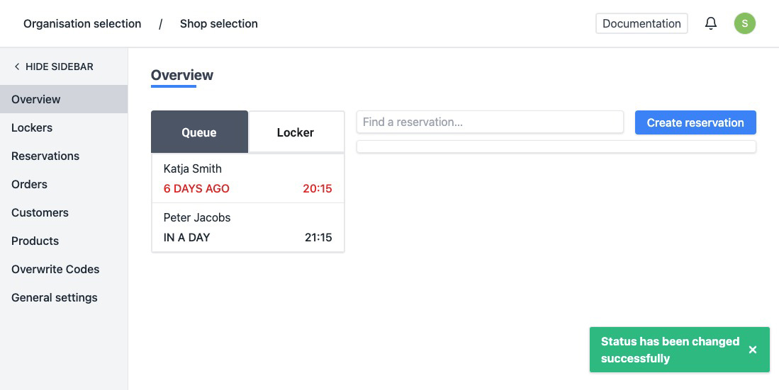 - When cancelled successfully, the page will be refreshed automatically and the reservation will no longer be present in the list and the locker. You will see a notification at the bottom right saying the status has been changed successfully.