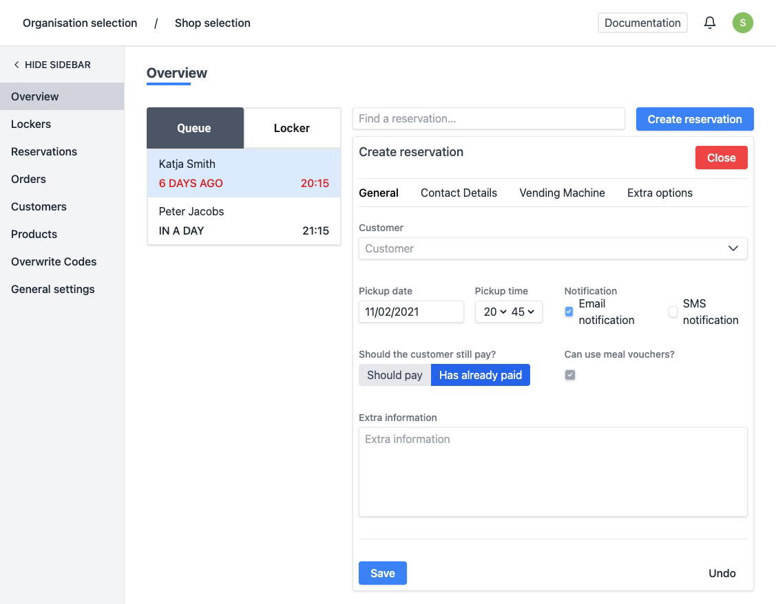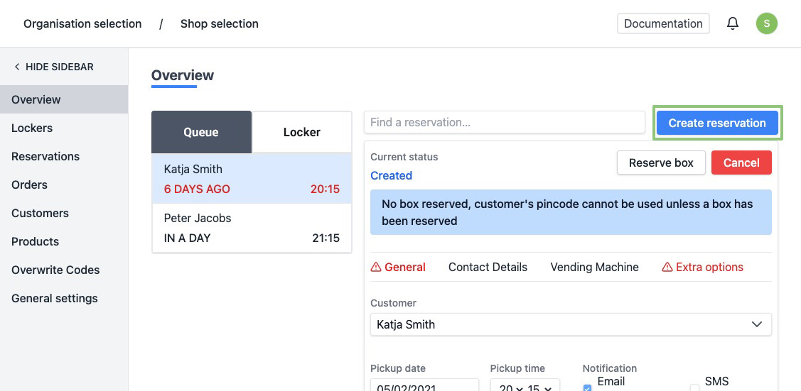 A reservation can be created at "Overview", "Reservations" or at "Lockers". For more information about the other pages, see:
