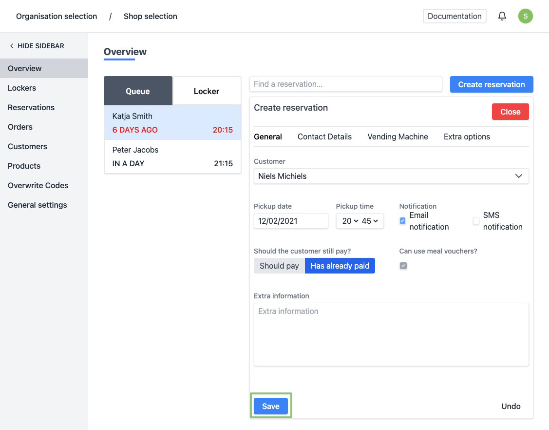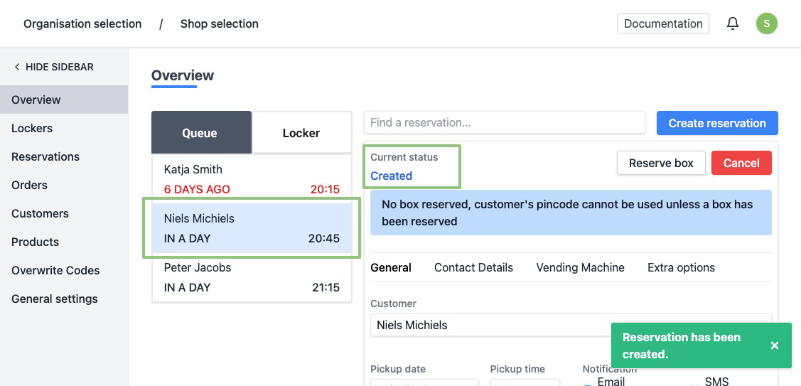 - Reserve box(s) - Check this if you do not want to automatically delete the reservation after collection, this way you can, for example, put a key in a box for your cleaning staff.