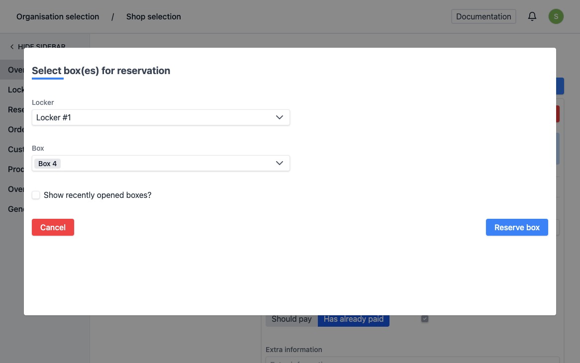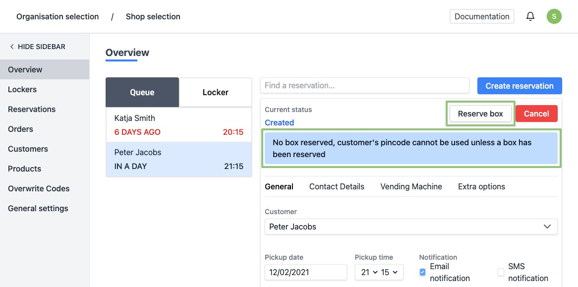 At the top of a reservation you can see whether it has already been assigned to a box. Click on "Reserve box" at the top right.