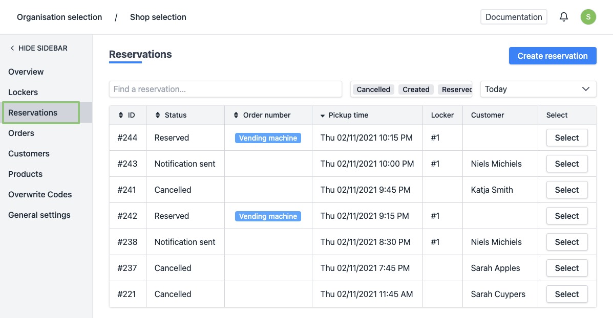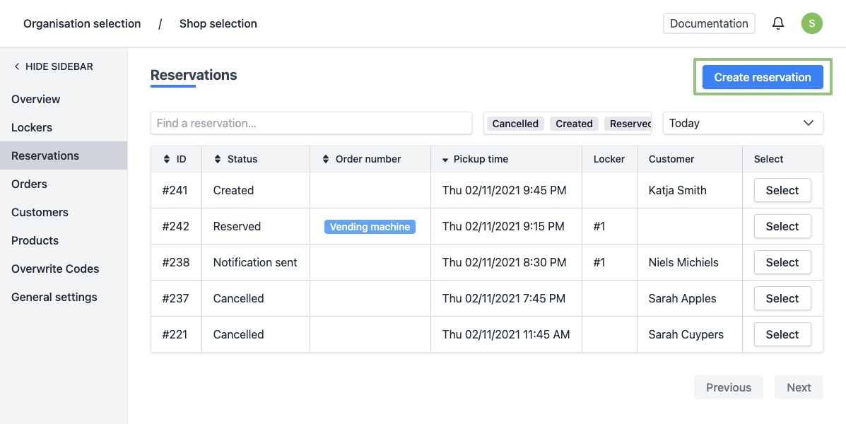 A reservation can be created at "Overview", "Reservations" or at "Lockers". For more information about the other pages, see: