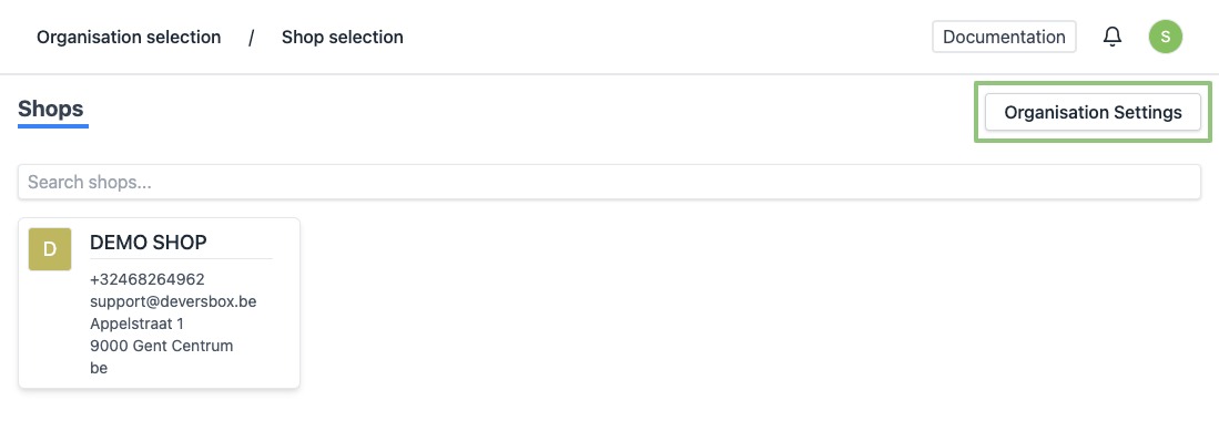 - Log in to https://app.viresmo.com. Select your organisation and, on the top right, click on "Organisation Settings".