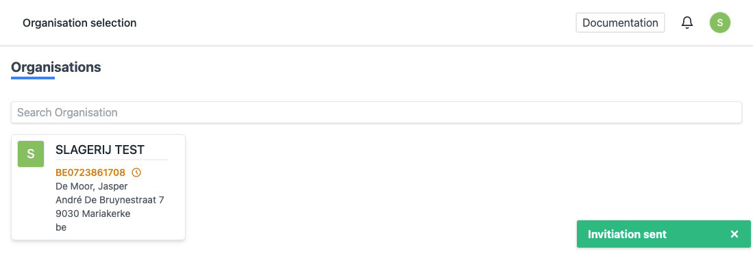 - When created succesfully, you will automatically be redirected to the overview of your oganization. You will see a notification at the bottom right saying the invitation has been sent.