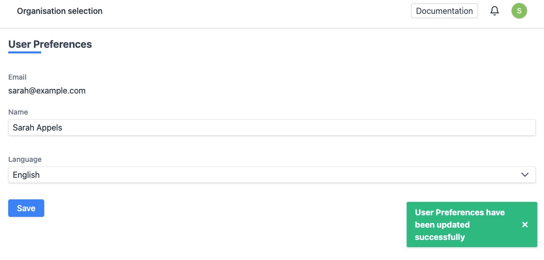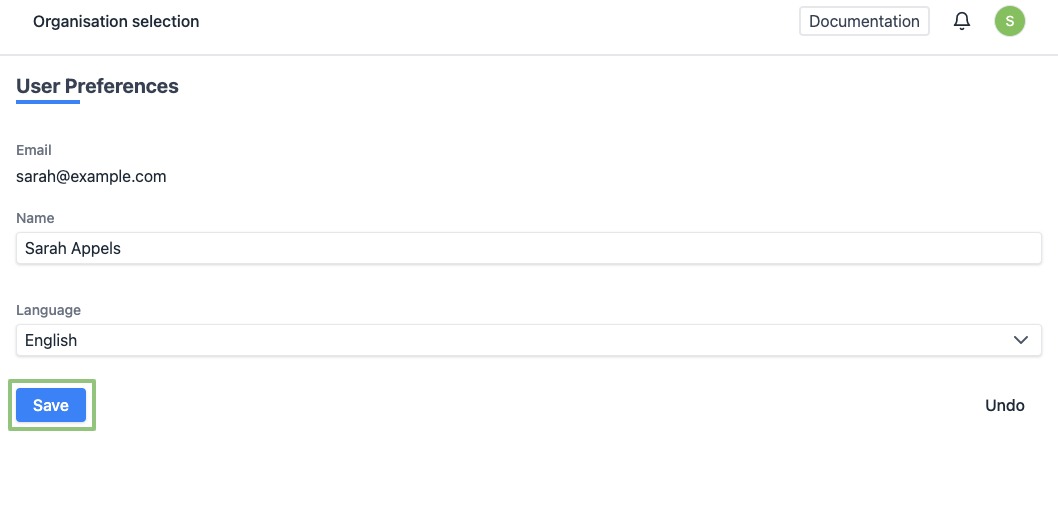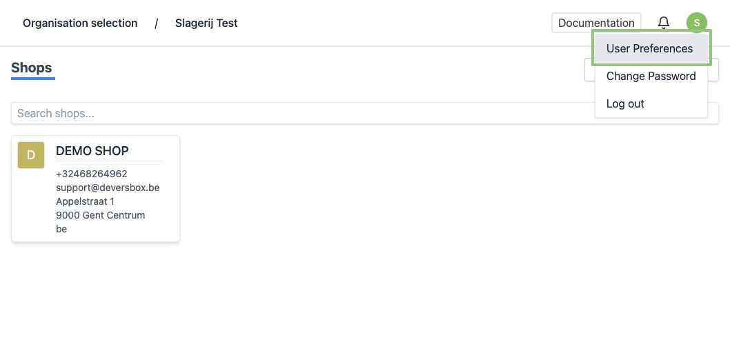 - In the top right corner, click the round icon with the initial of your firstname. A dropdown menu appears. Click “User Preferences”.