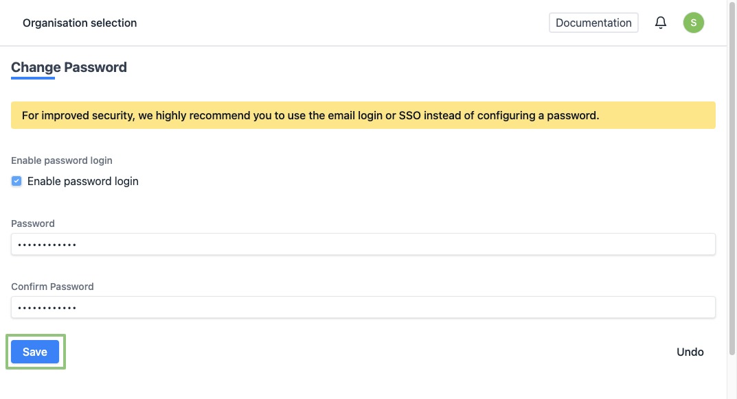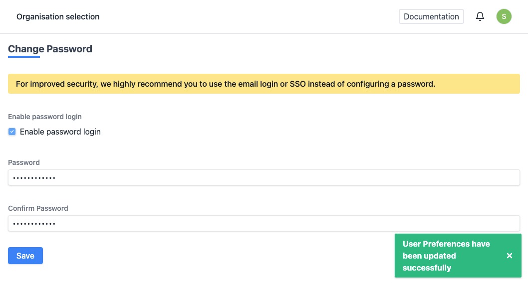 Attention! For improved security, we highly recommend you to use the email login or SSO instead of configuring a password. When using the single sign on login method, a code will be sent to your e-mail address every time you wish to log in. You then enter the code in the site as your final login step.