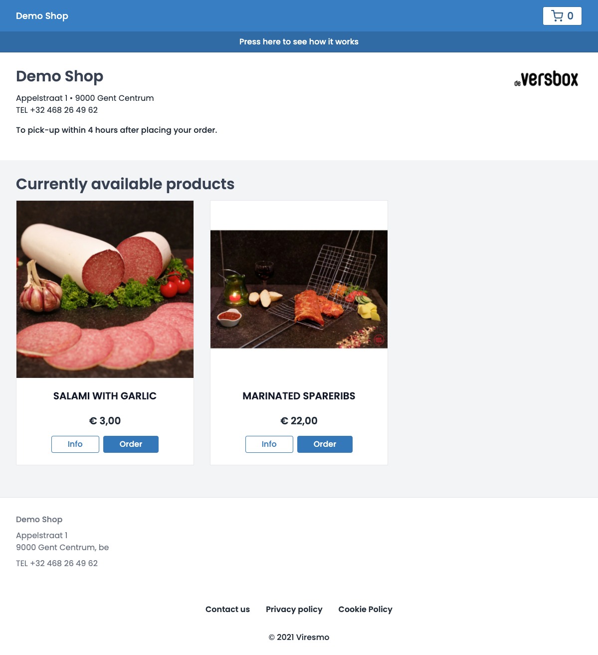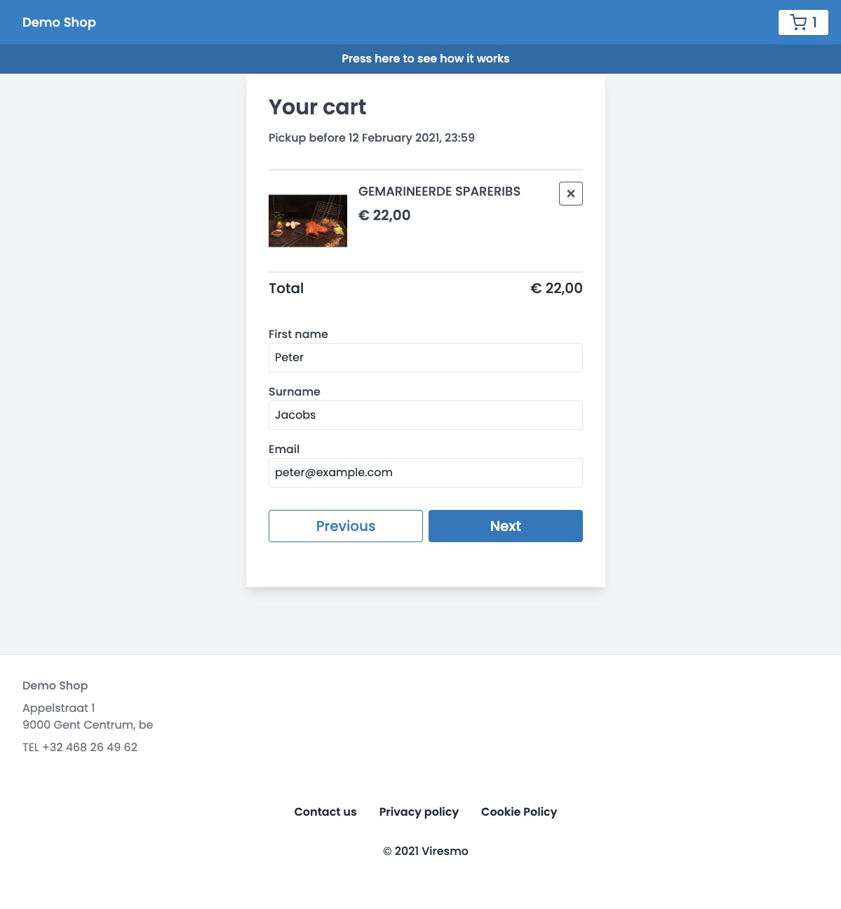 - To add a product to the basket, one clicks on "Order". Your customer will be redirected to their Shopping Cart. When he has finished ordering, he fills in his details. This information is used to send a message with his collection code. Then one clicks on "Next".