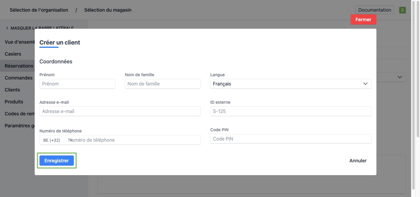 Il est recommandé de renseigner au moins 1 des coordonnées (email ou téléphone) lors de la création d'un client. Dans le cas contraire, il n'y a aucune possibilité d'informer le client de l'état de sa commande. Si les deux champs sont vides, vous verrez une notification après la création.