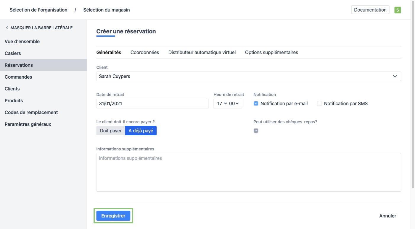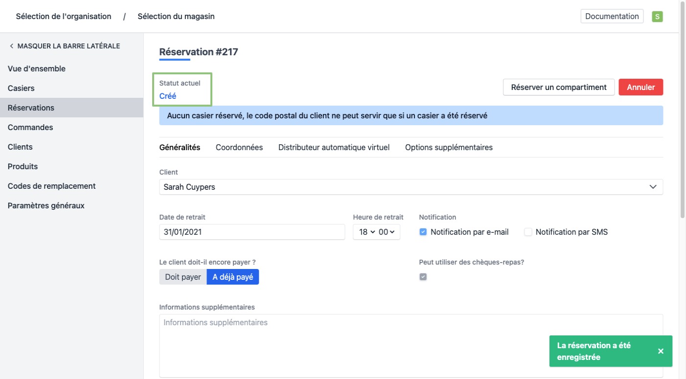 - Réservation rectifiée - Cochez cette case si vous ne souhaitez pas supprimer automatiquement la réservation après la collecte, de cette manière vous pouvez, par exemple, mettre une clé dans un compartiment pour le personnel de nettoyage.